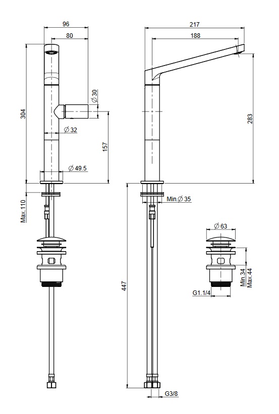 wysięg wylewki: 188 mm