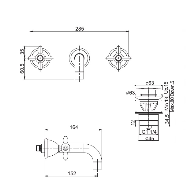 Carlo Frattini Olivia Bateria umywalkowa ścienna 3-otworowa z korkiem Chrom F5001/5CR