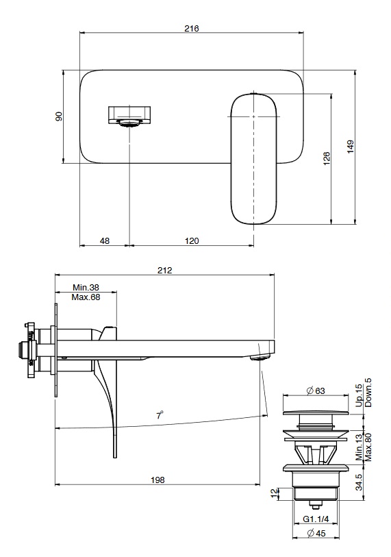 wysięg wylewki: 198 mm