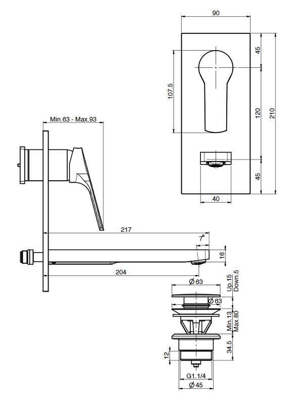 wysięg wylewki: 204 mm