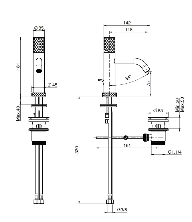 wysięg wylewki: 118 mm
