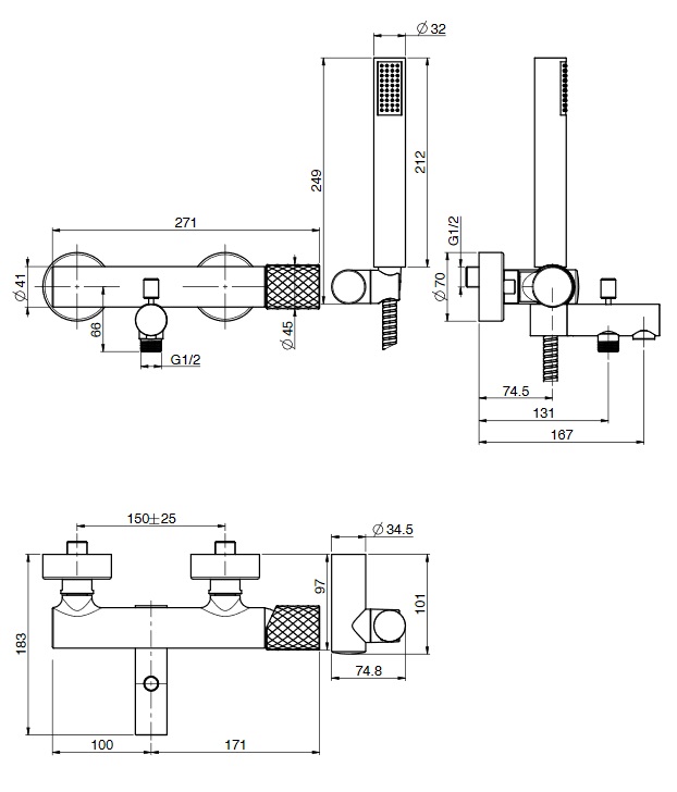 Carlo Frattini Spillo Tech Bateria wannowa z zestawem natryskowym ścienna Chrom F3034VCR