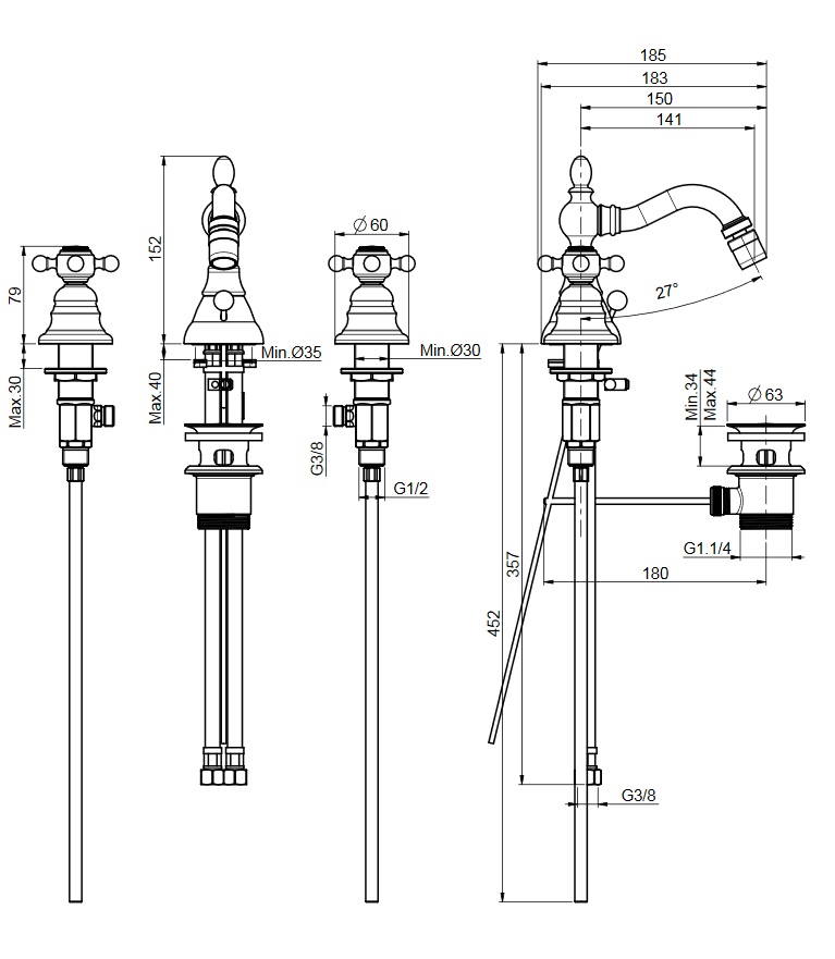 Carlo Frattini Elizabeth Bateria bidetowa 3-otworowa z korkiem automatycznym Chrom F5082CR