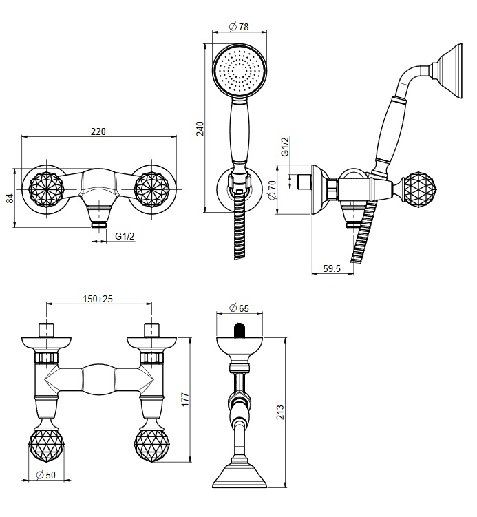 Carlo Frattini Elizabeth Chic Bateria natryskowa ścienna ze słuchawką Chrom F5085CCR