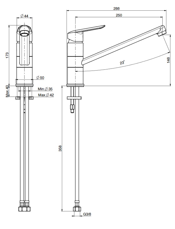 2 elastyczne węże przyłączeniowe 370 mmobrotowa wylewkaKolor: ChromWymiary:wysokość: 173 mmwysięg wylewki: 250 mmwysokość wylewki: 146 mmCena dotyczy baterii kuchennej.