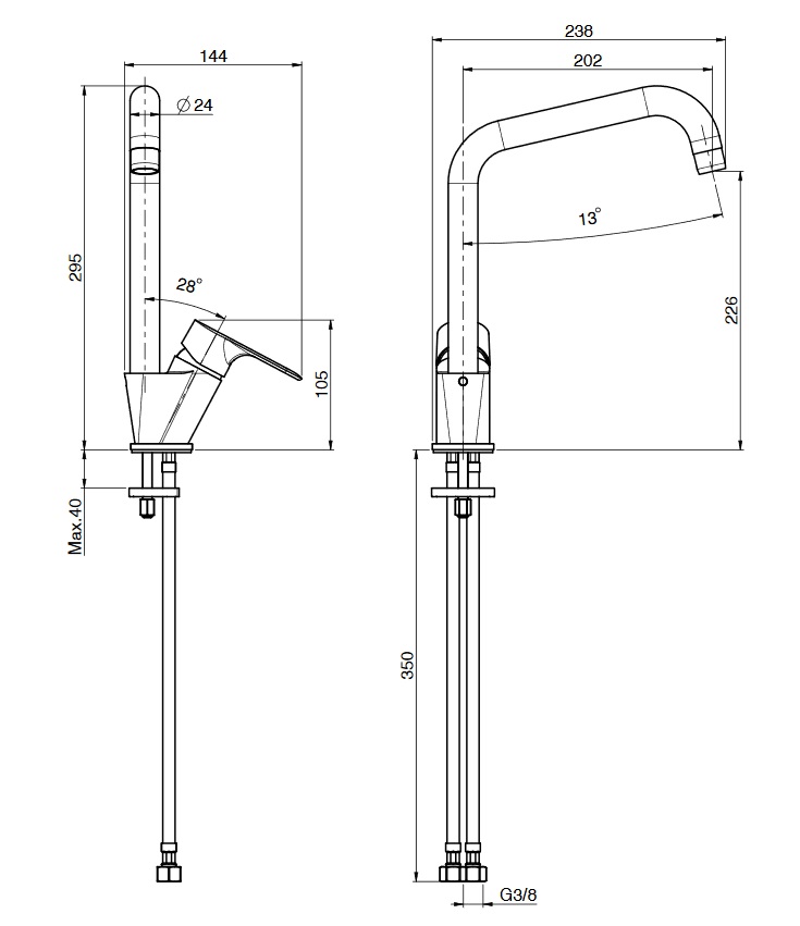 2 elastyczne węże przyłączeniowe 370 mmobrotowa wylewkaKolor: ChromWymiary:wysokość: 295 mmwysięg wylewki: 202 mmwysokość wylewki: 226 mmCena dotyczy baterii kuchennej.