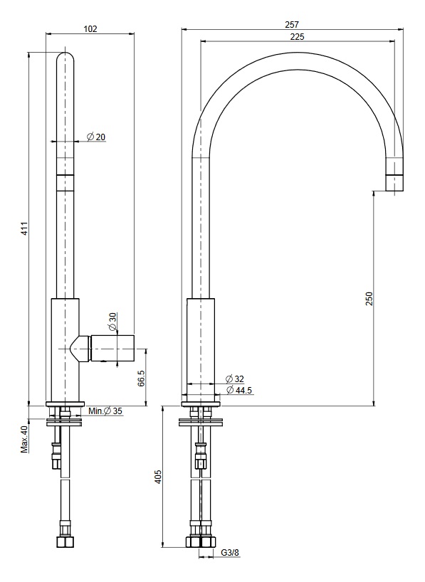 2 elastyczne węże przyłączeniowe 400 mmobrotowa wylewkaKolor: ChromWymiary:wysokość: 411 mmwysięg wylewki: 225 mmwysokość wylewki: 250 mmszerokość: 102 mmCena dotyczy baterii kuchennej.