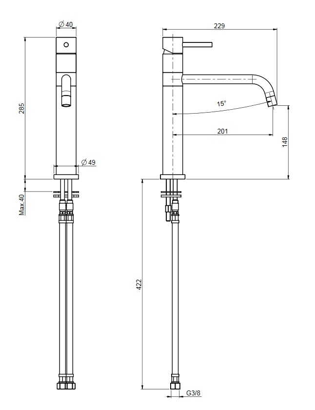 Wymiary: wysokość: 285 mm wysięg wylewki: 201 mm wysokość wylewki: 148 mm szerokość: 40 mm