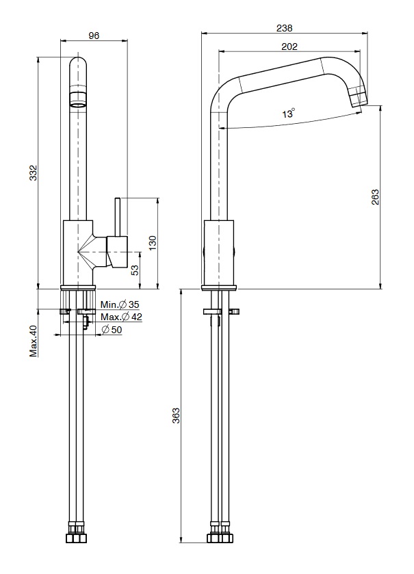 Wymiary: wysokość: 332 mm wysięg wylewki: 202 mm wysokość wylewki: 263 mm szerokość: 96 mm
