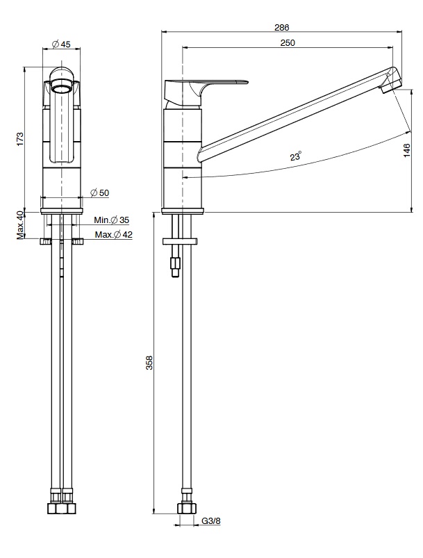 2 elastyczne węże przyłączeniowe 370 mmobrotowa wylewkaKolor: ChromWymiary:wysokość: 173 mmwysięg wylewki: 250 mmwysokość wylewki: 146 mmszerokość: 45 mmCena dotyczy baterii kuchennej.