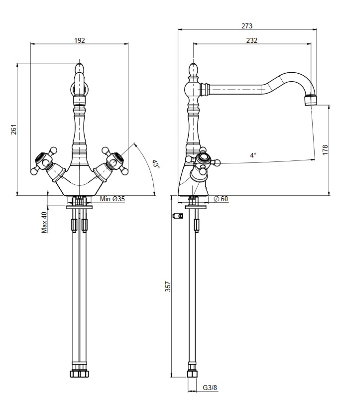 Wymiary: wysokość: 261 mm wysięg wylewki: 232 mm wysokość wylewki: 178 mm szerokość: 192 mm