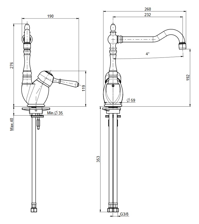 Wymiary: wysokość: 276 mm wysięg wylewki: 232 mm wysokość wylewki: 192 mm szerokość: 190 mm