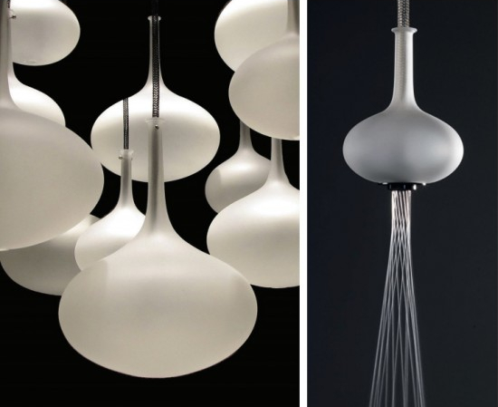 - 10 wiszących elementów z ręcznie dmuchanego szkła matowego,