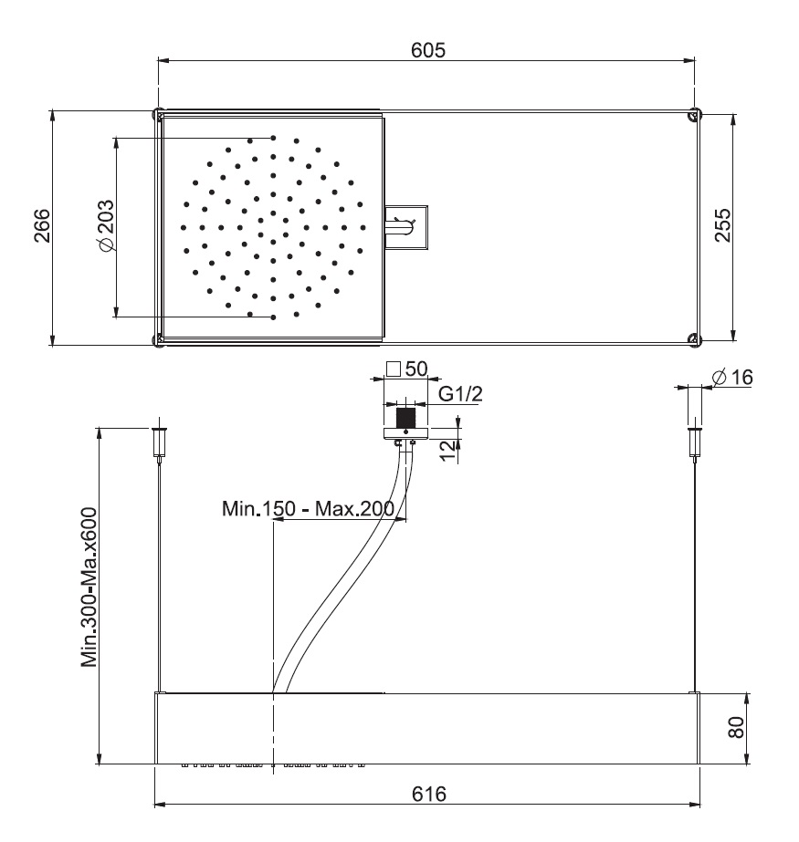 Wymiary: szerokość: 266 mm długość: 605 mm grubość obudowy: 80 mm wysokość mopntażu: 300 - 600 mm