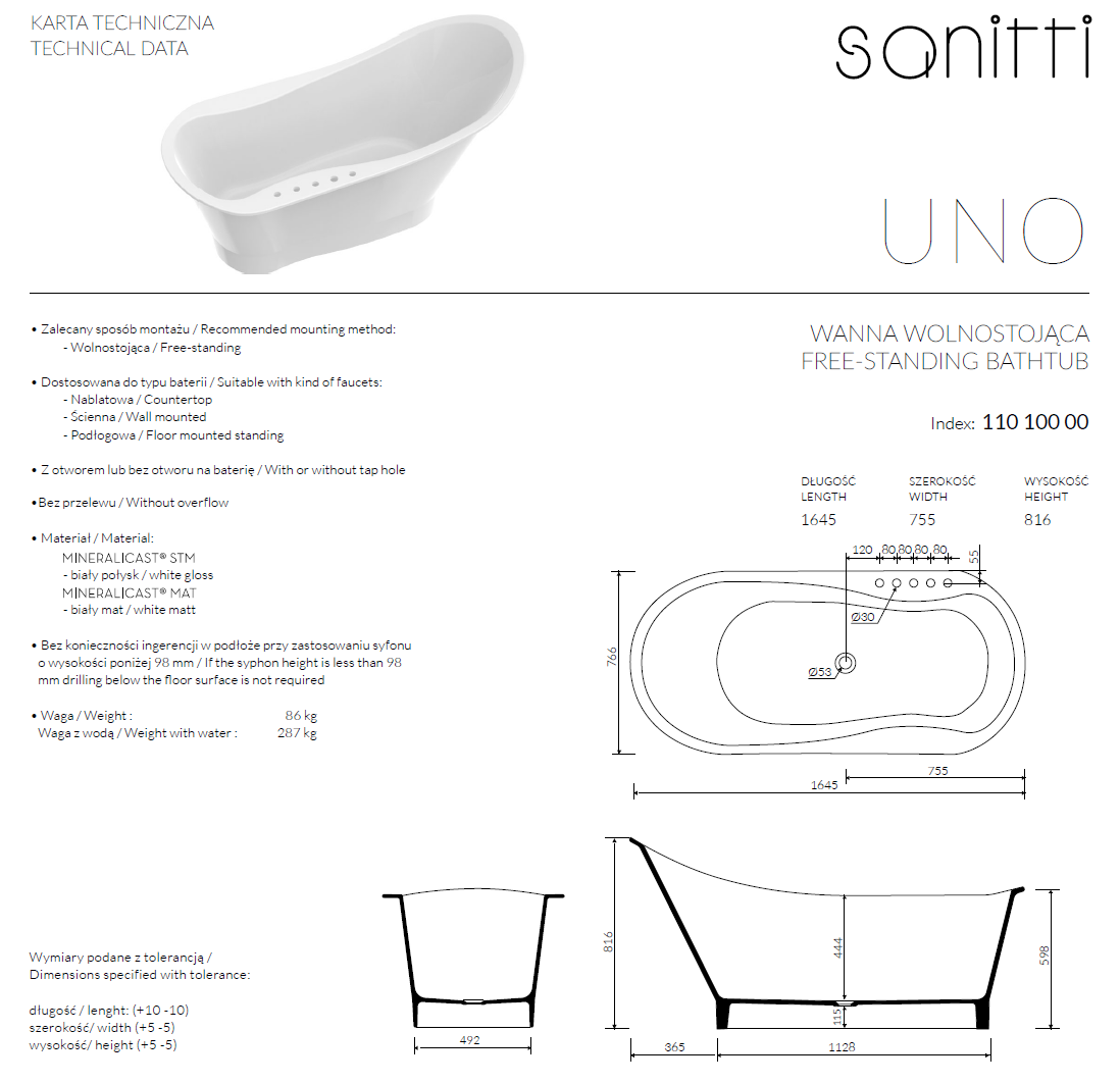 Sanitti UNO Wanna wolnostojąca 164,5x76,6 cm Biały połysk 11010000-BP