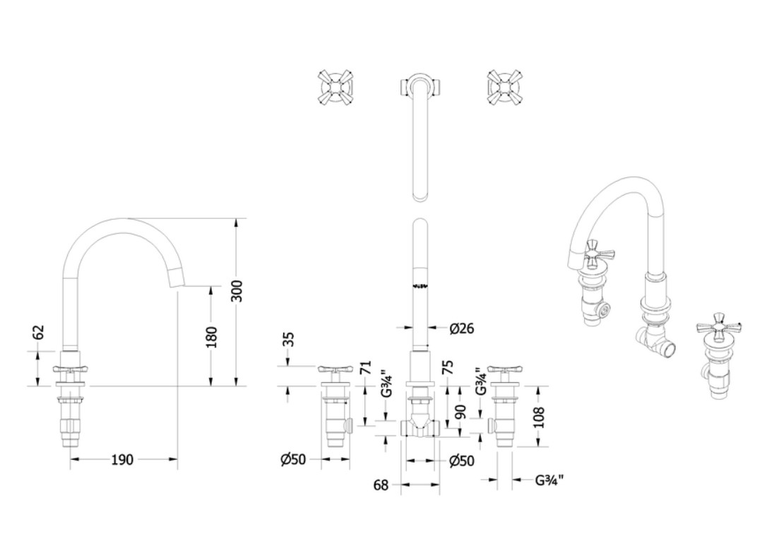 Burlington Riviera Bateria wannowa 3-otworowa na brzeg wanny Złota RIV32GOLD