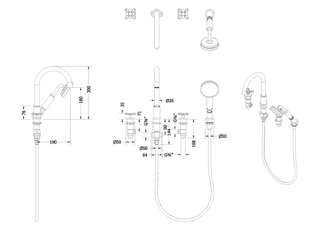 Burlington Riviera Bateria wannowa 4-otworowa na brzeg wanny Złota RIV33GOLD