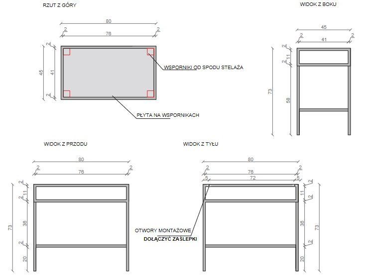 Konsola umywalkowa wyposażona jest w półkę, która zamontowana jest na całej jej długości. Można na niej umieścić zapasowe ręczniki, przybory kosmetyczne lub niezbędne w łazience środki czystości. Powyżej znajduje się dodatkowy profil, który nadaje całości geometrycznego designu.