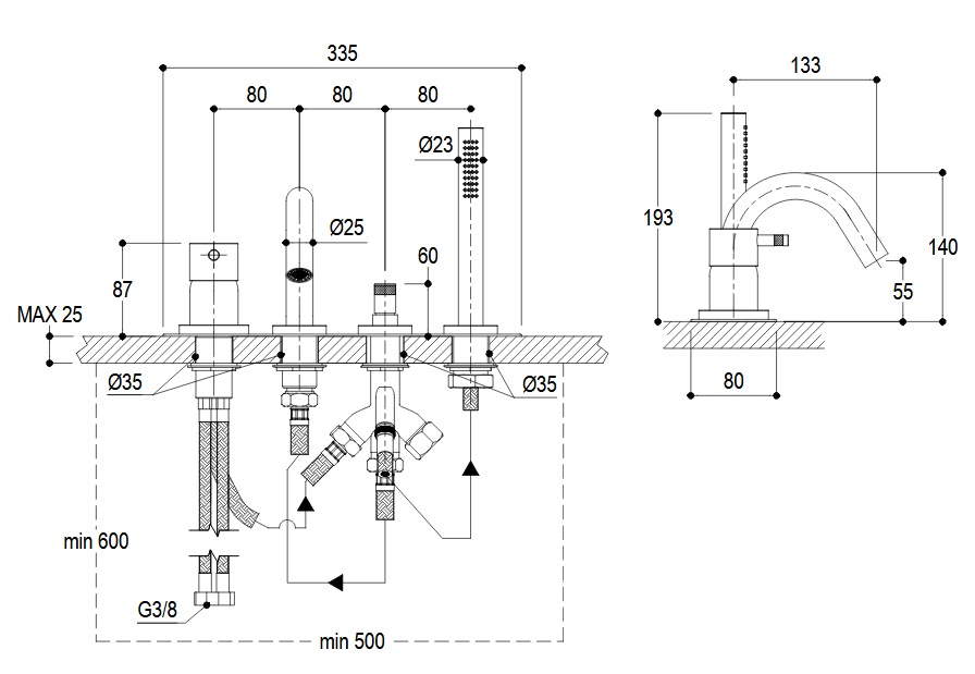 Ritmonio Diametro35 Bateria wannowa na brzeg wanny 4-otworowa stal nierdzewna E0BA0432INOX