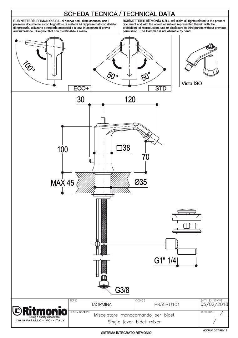 Ritmonio Taormina Bateria bidetowa jednootworowa z korkiem automatycznym chrom PR35BU101CRL