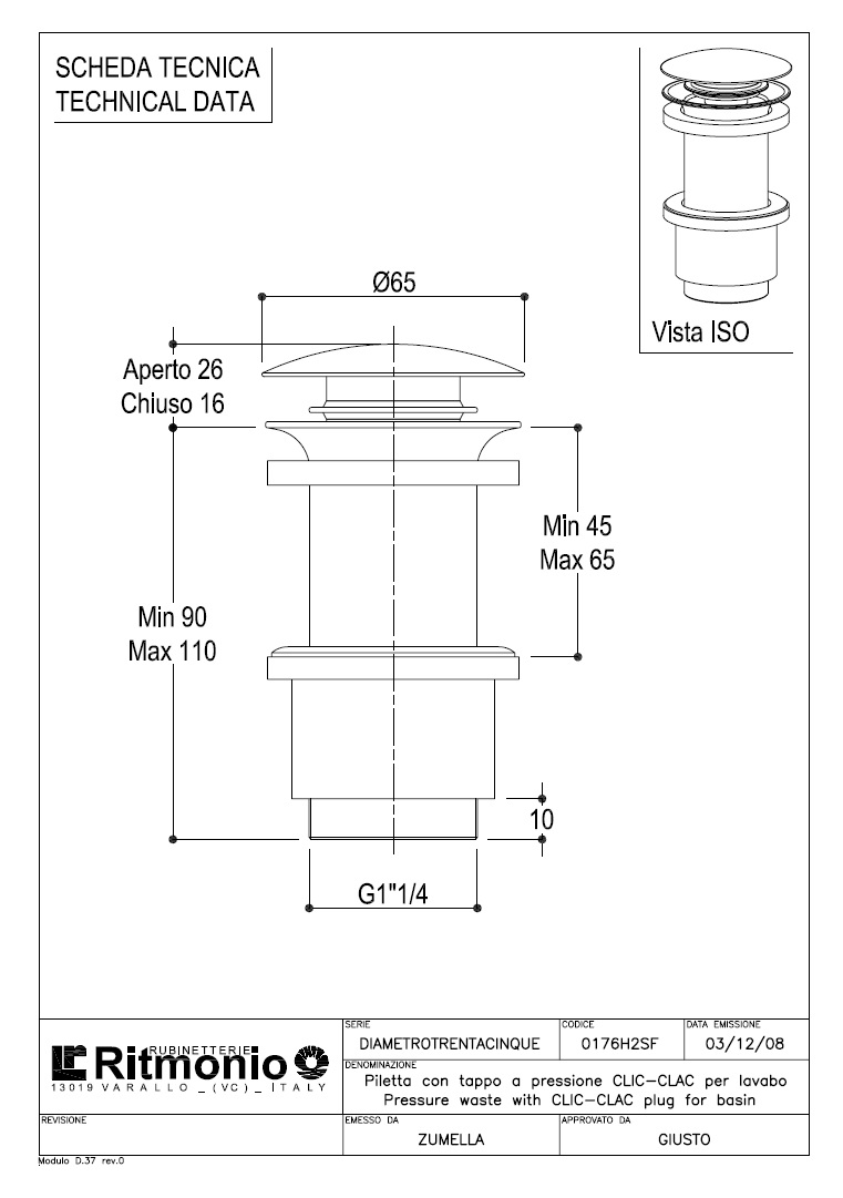 Ritmonio Korek umywalkowy Click-Clack z przelewem chrom E0BA0176H2SFCRL