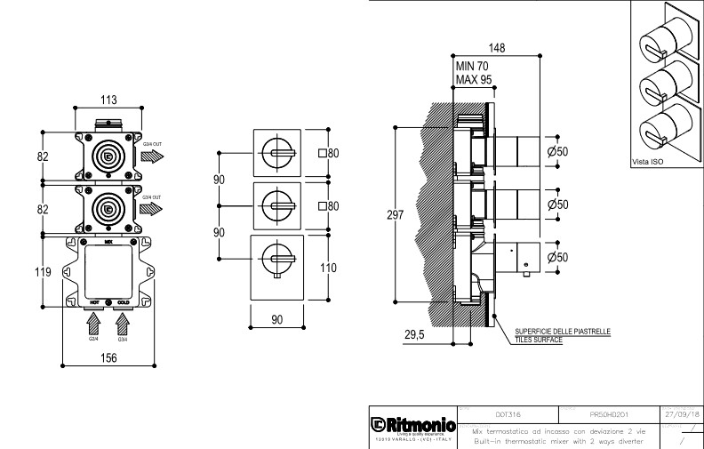 Ritmonio DOT316 Bateria wannowo-prysznicowa termostatyczna podtynkowa stal nierdzewna PR50HE201INOX