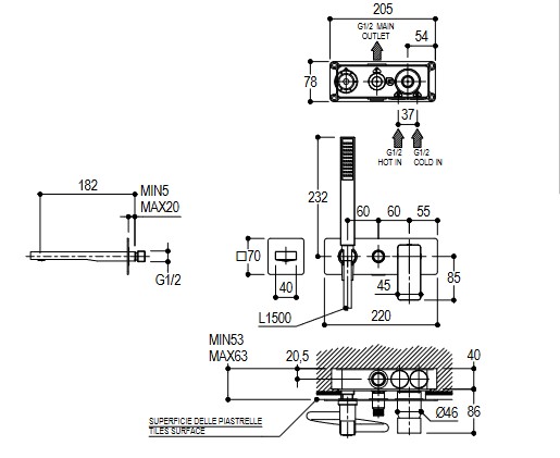 Wymiary: Długość wylewki: 182 mmWąż prysznicowy: 1500 mmSłuchawka: 232 mmCena dotyczy zestawu