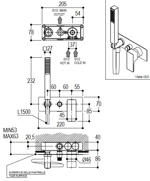 Wymiary: Długość węża: 1500 mmWysokość: 70 mmSłuchawka: 232 mm
