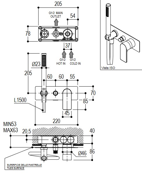 Wymiary: Długość węża: 1500 mmWysokość: 70 mmSłuchawka: 205 mm