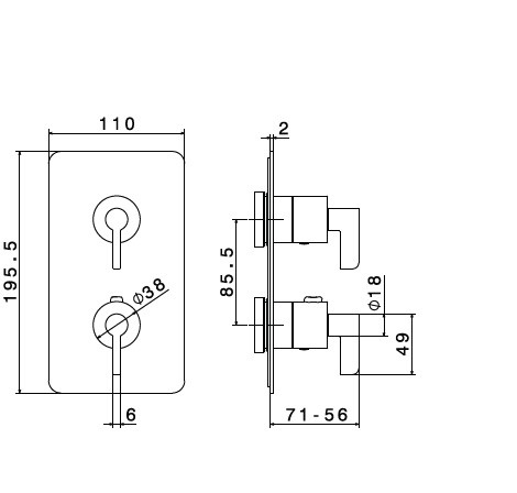 Z jednym uchwytem do regulacji temperatury i jednym uchwytem do zasilania i przepływu wody