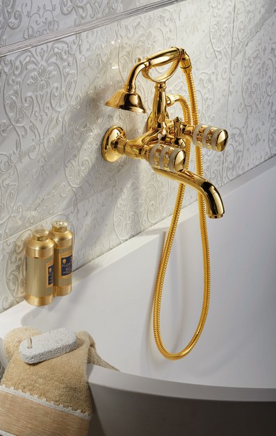 Newform Deluxe Prestige Bateria wannowa ścienna z mechanicznym przełącznikiem wanna/prysznic i zestawem prysznicowym złoty 68140C.61.020