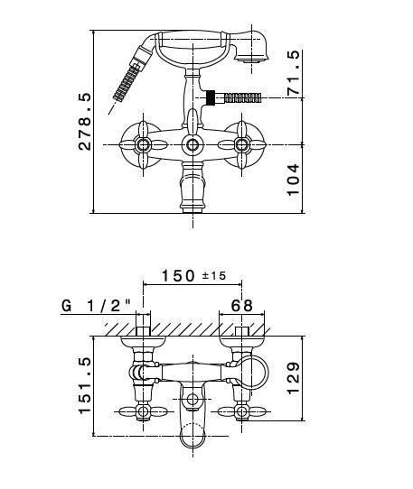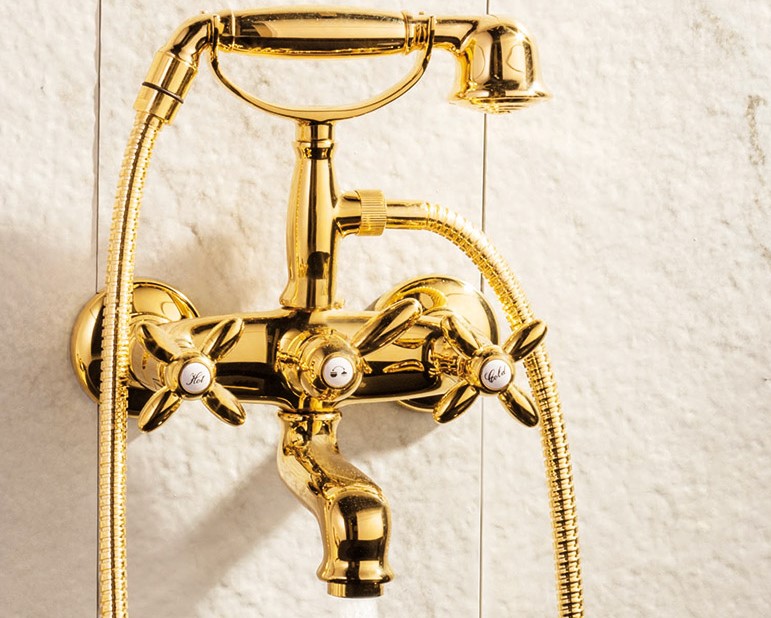 Newform Antea Bateria wannowa ścienna z mechanicznym przełącznikiem wanna/prysznic i zestawem prysznicowym złoty 9135.61.020